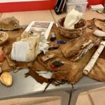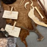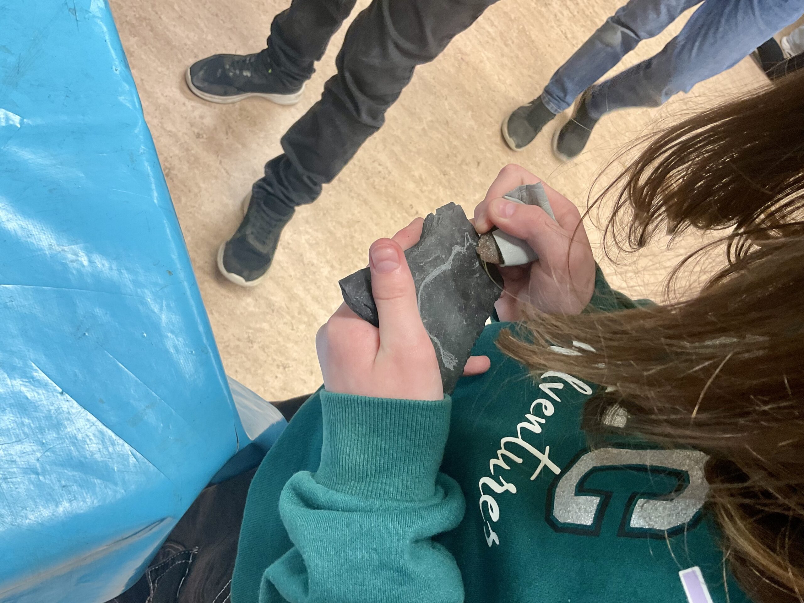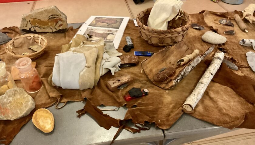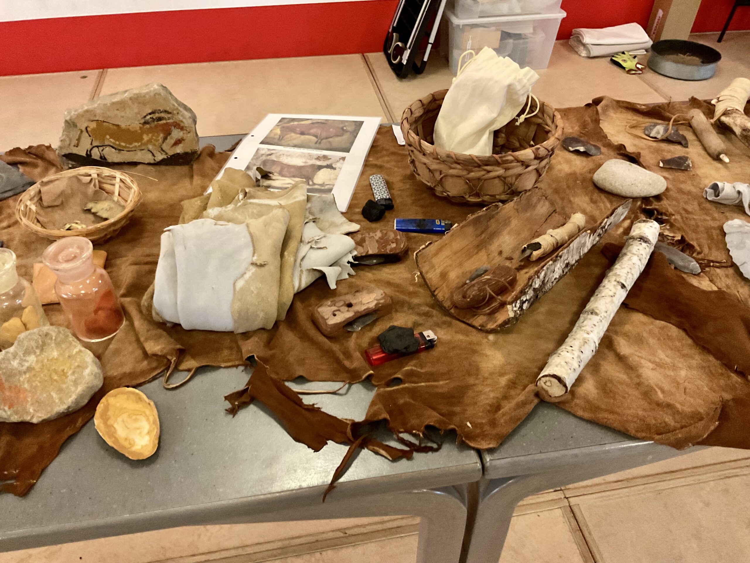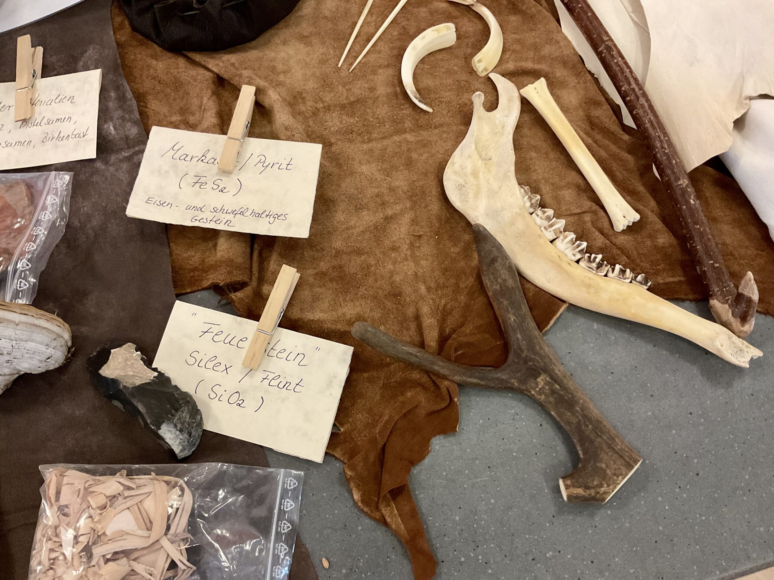 Schon beim Betreten der Aula und des GeWi-Raumes wurde klar: Hier wartet eine echte Zeitreise! Auf großen Fellen und naturgetreuen Nachbildungen früher Werkzeuge präsentierte Frau Hansen zahlreiche Materialien aus dem Alltag der Steinzeitmenschen – von Feuersteinklingen über Farbpigmente bis hin zu Lederstücken und Birkenrinde.