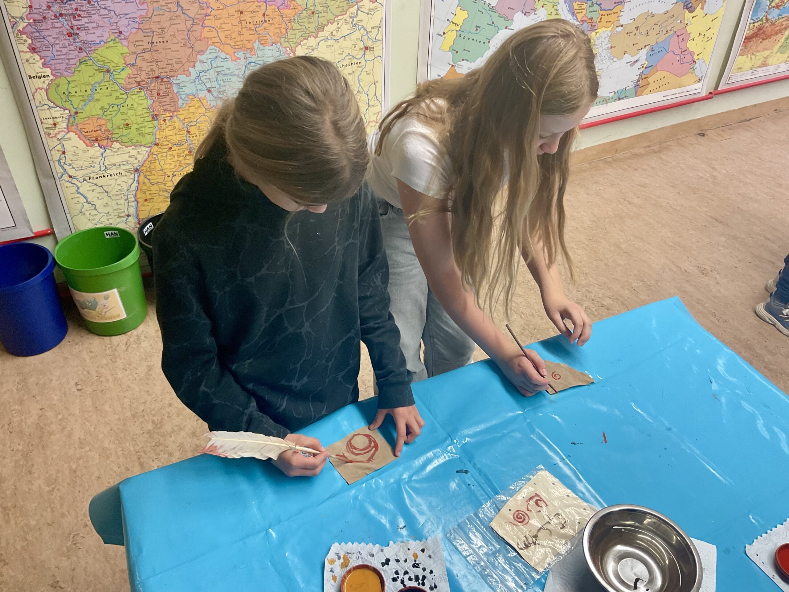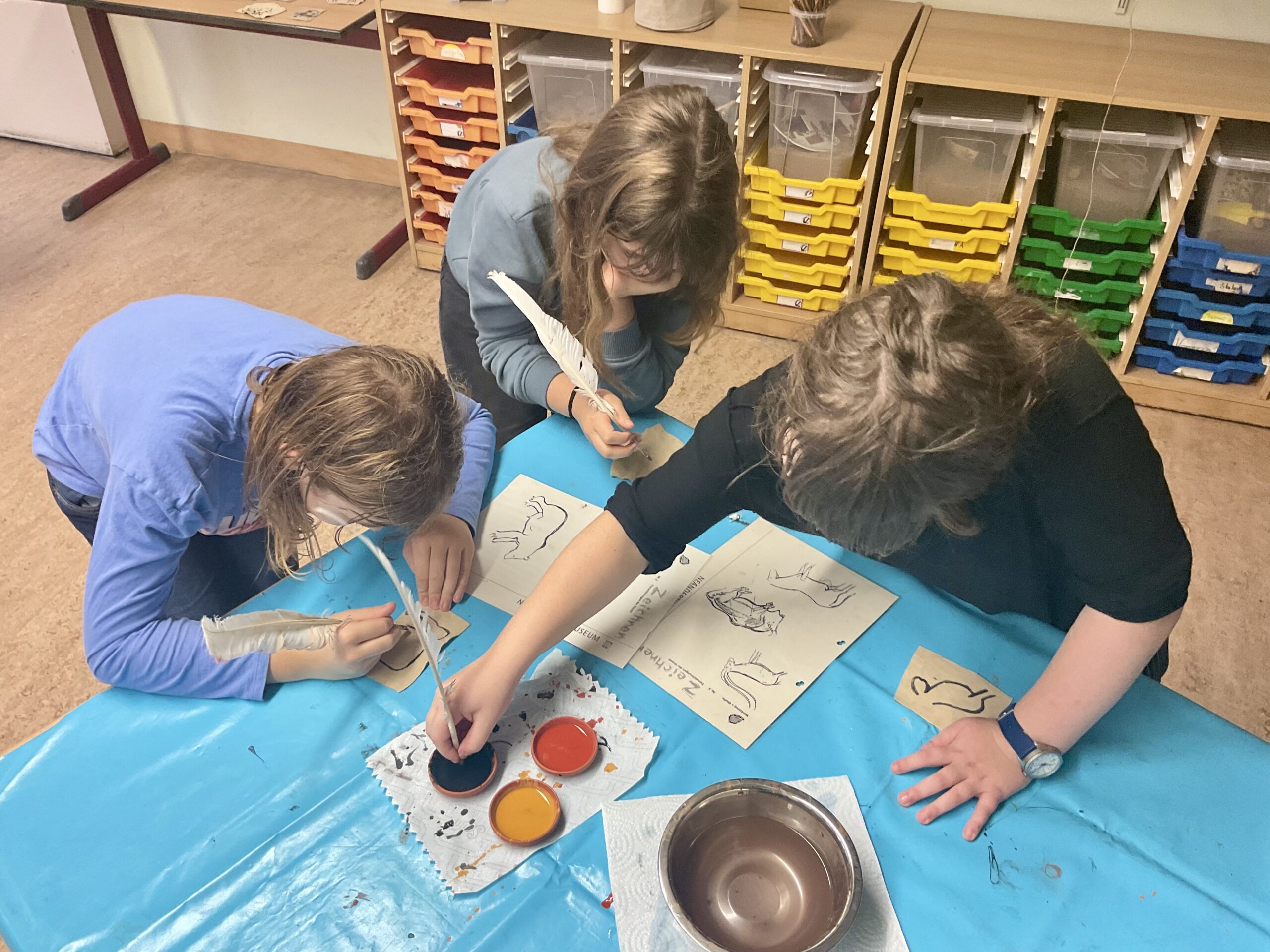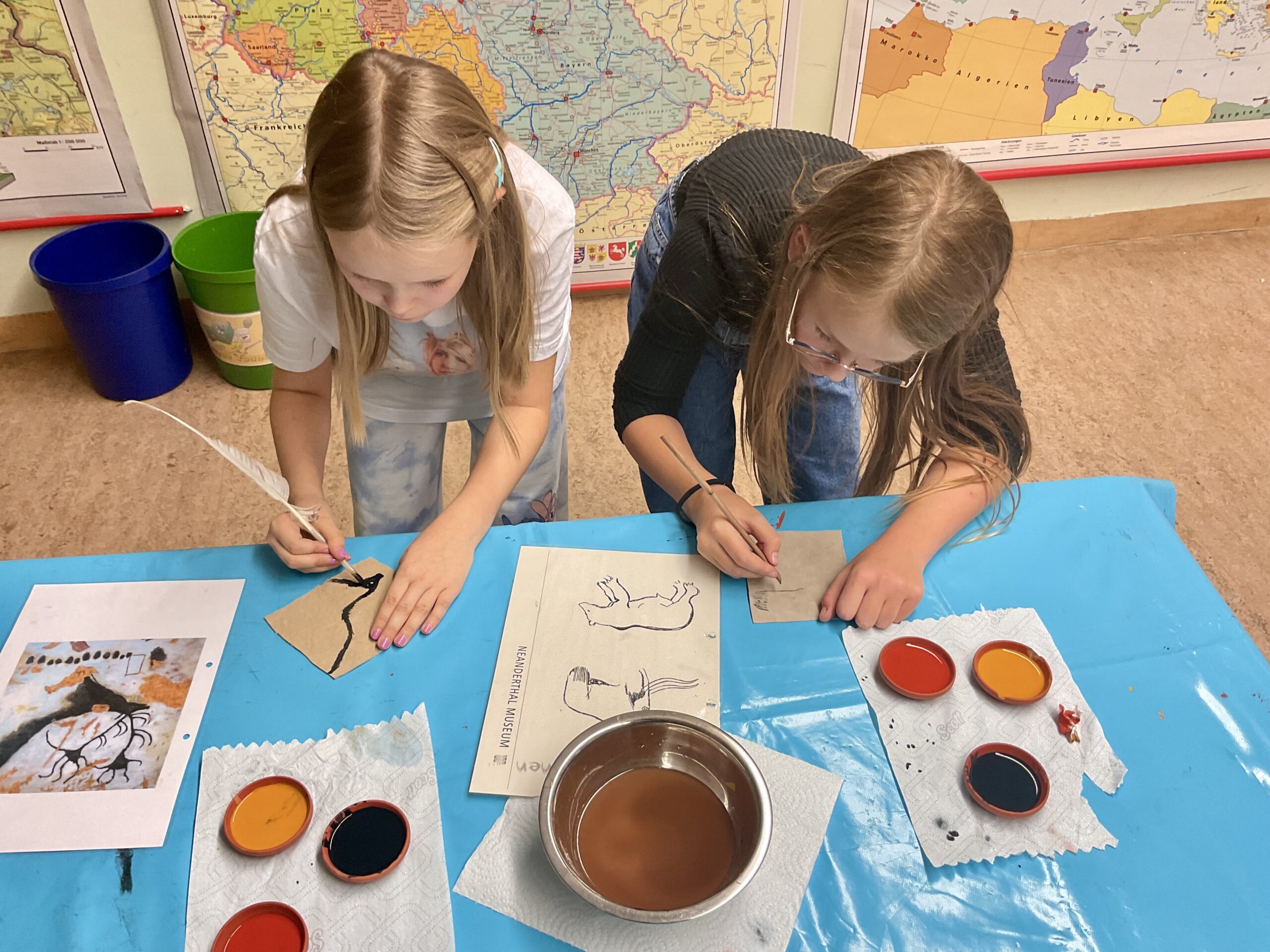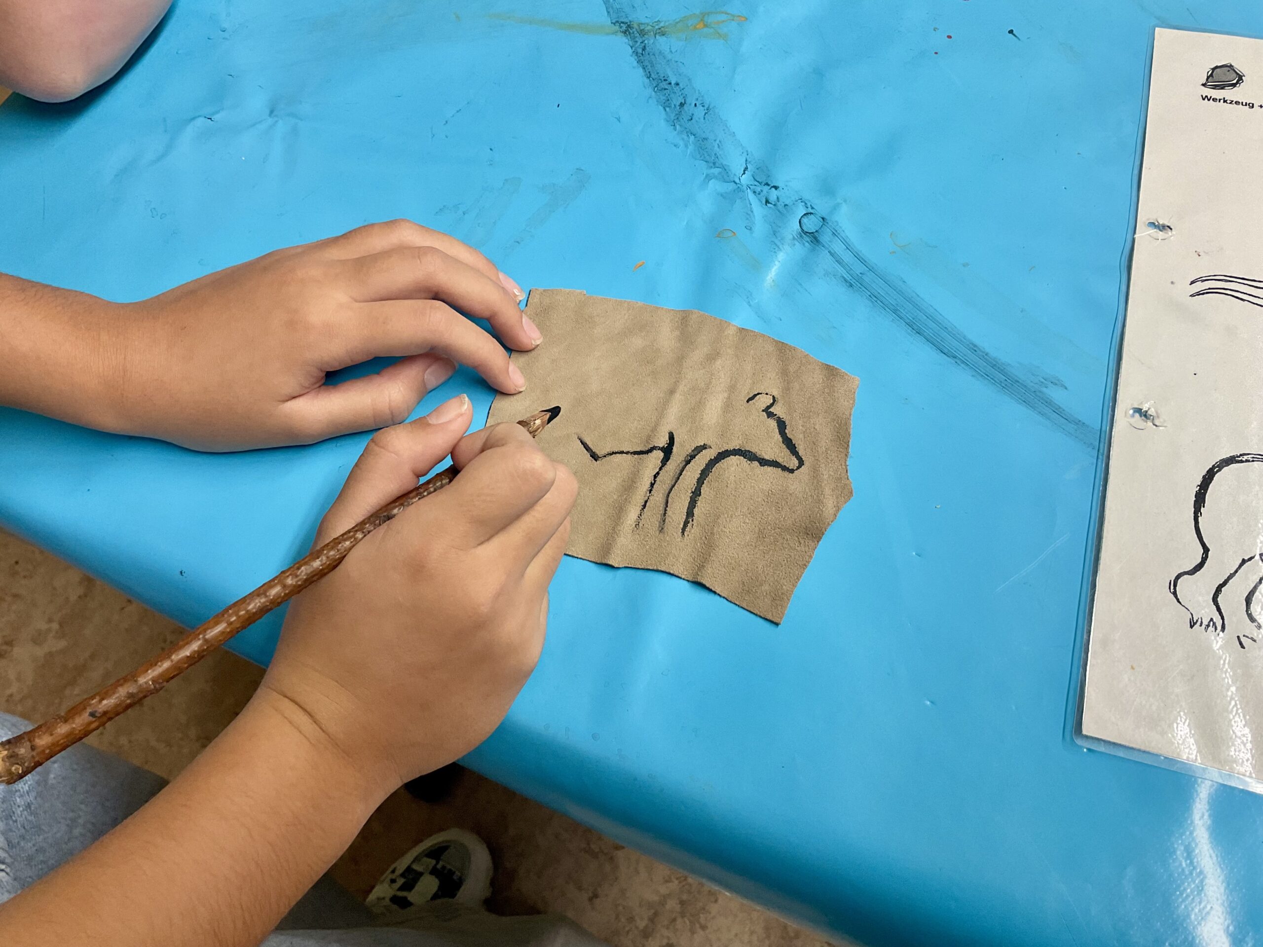 Auch die Höhlenmalerei zog die Kinder sofort in ihren Bann. Mit selbst angerührten Naturfarben, Federn und Kohle entstanden beeindruckende Kunstwerke: Mammuts, Pferde, Auerochsen und geheimnisvolle Symbole. Einige zeichneten direkt auf Schieferplatten, andere auf selbst „gealtertem“ Papier – ganz wie in den berühmten Höhlen von Lascaux und Altamira.