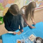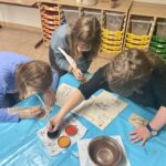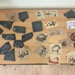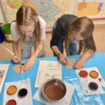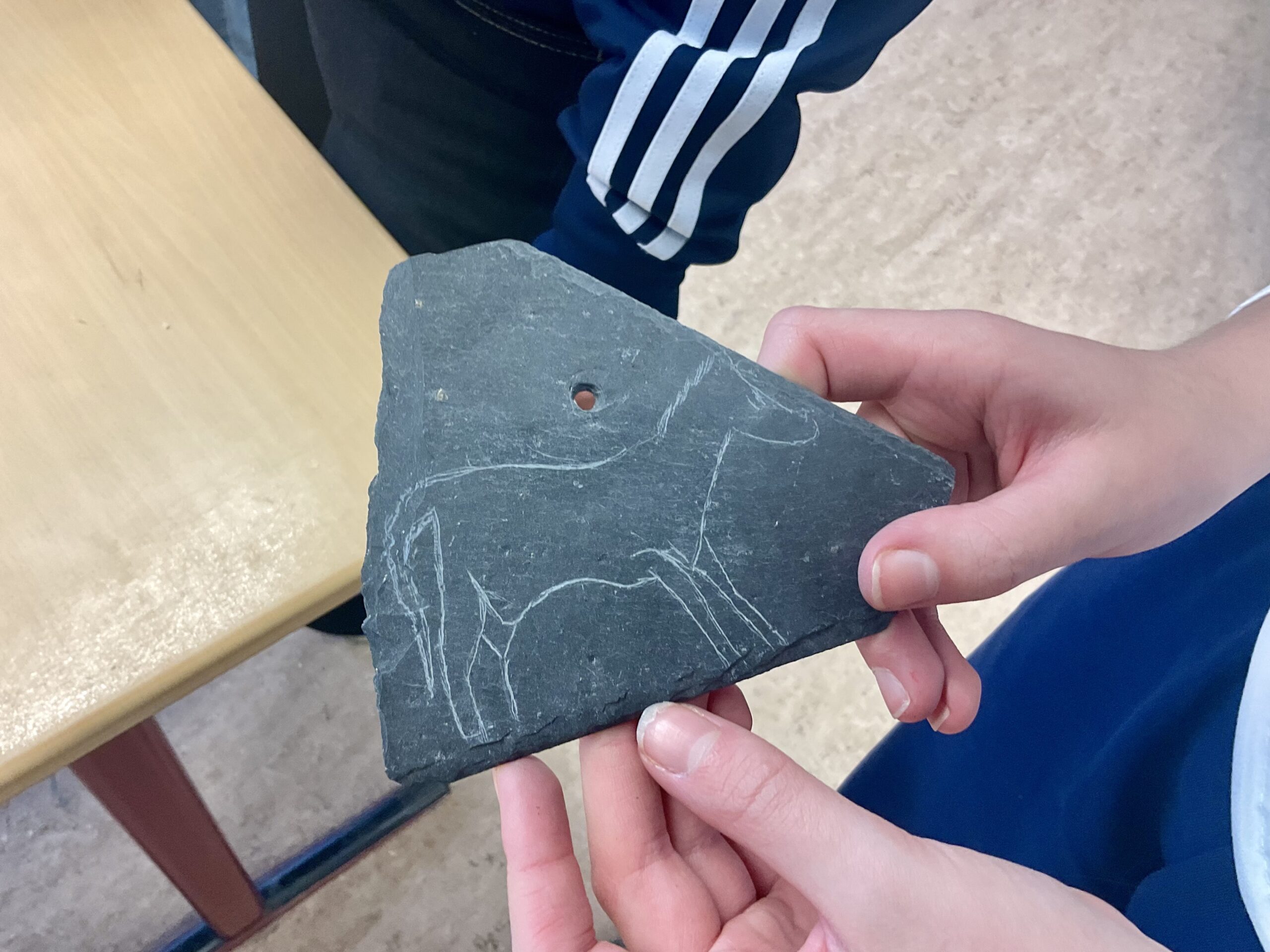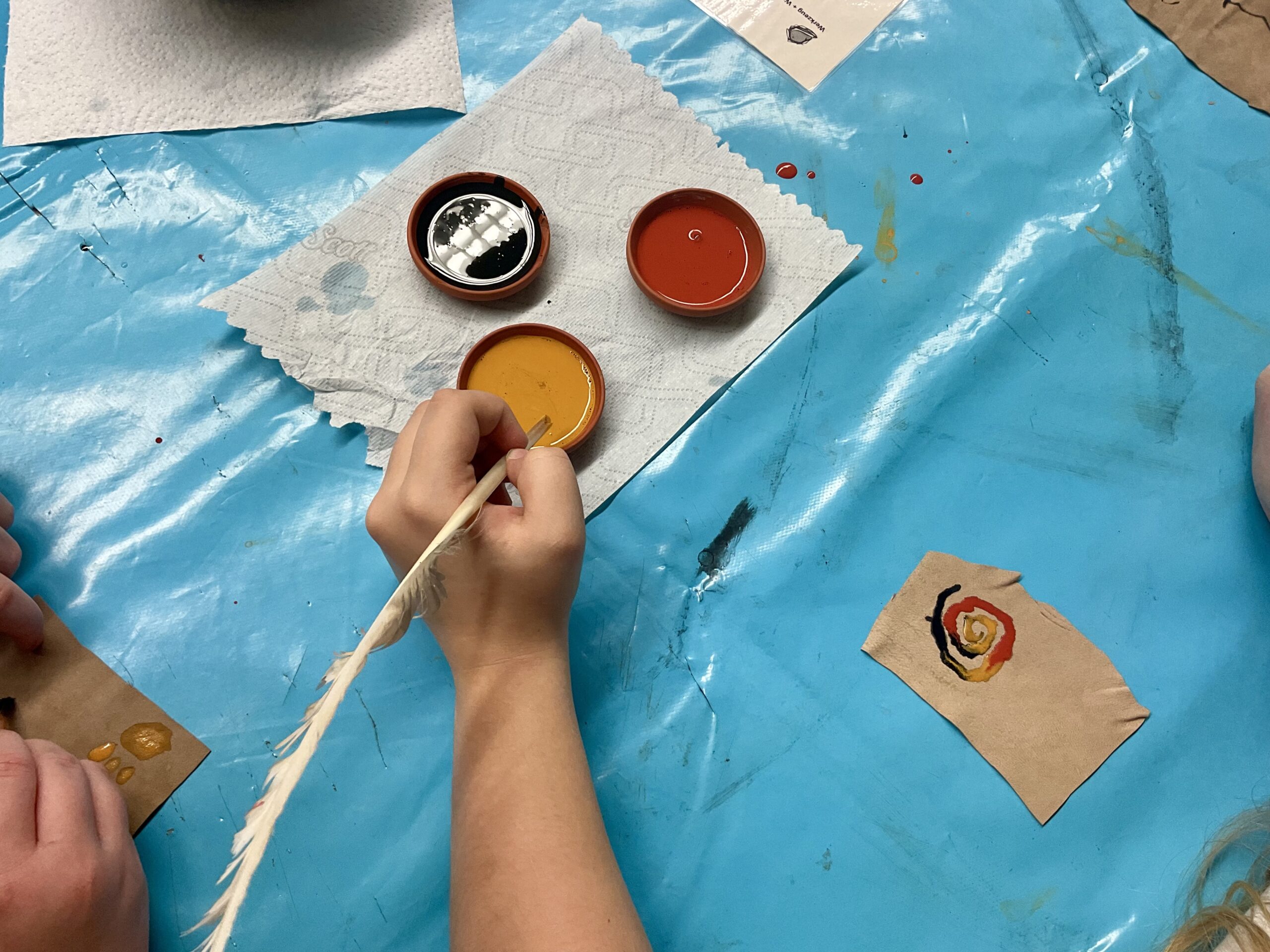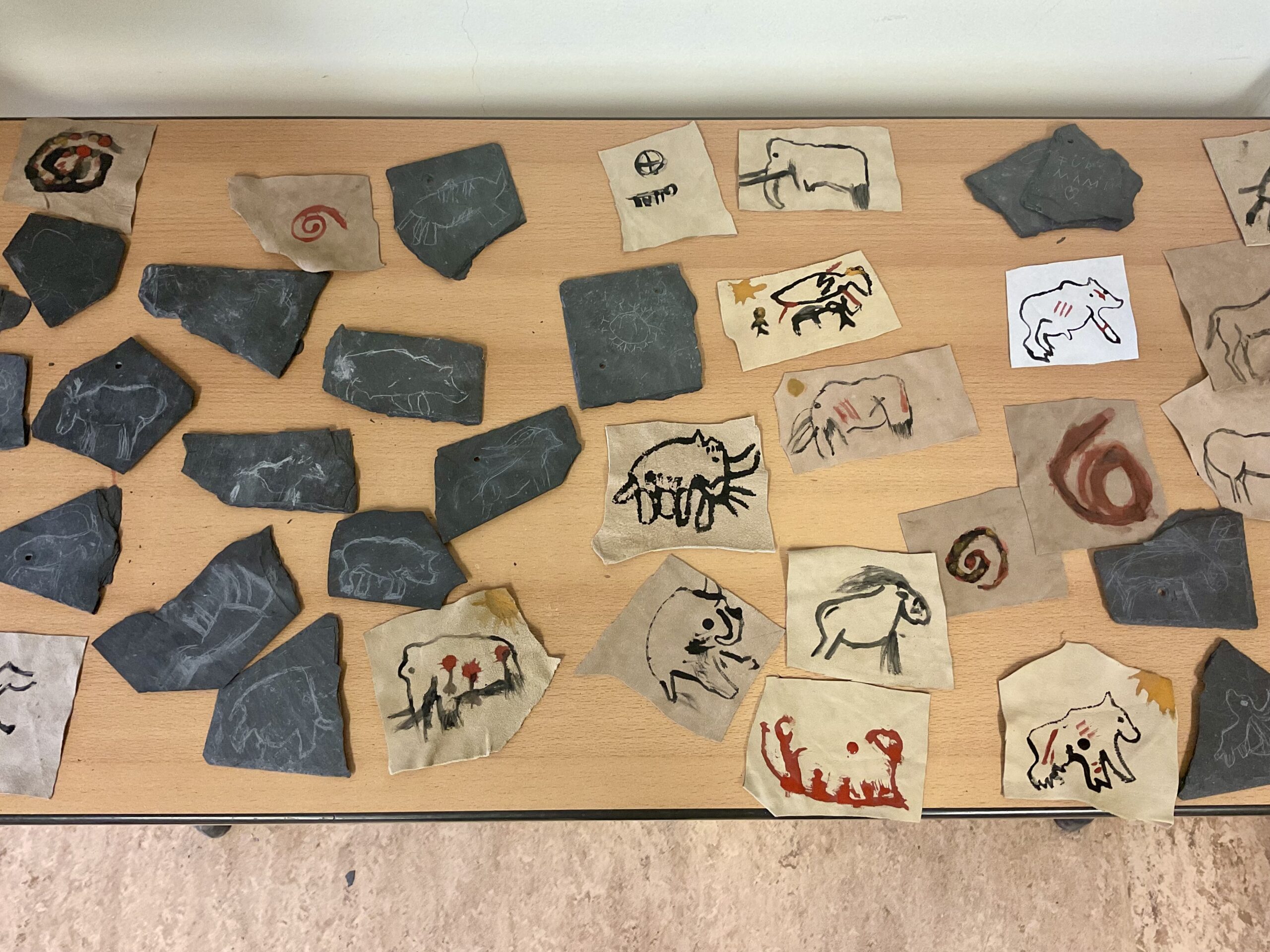 Auch die Höhlenmalerei zog die Kinder sofort in ihren Bann. Mit selbst angerührten Naturfarben, Federn und Kohle entstanden beeindruckende Kunstwerke: Mammuts, Pferde, Auerochsen und geheimnisvolle Symbole. Einige zeichneten direkt auf Schieferplatten, andere auf selbst „gealtertem“ Papier – ganz wie in den berühmten Höhlen von Lascaux und Altamira.