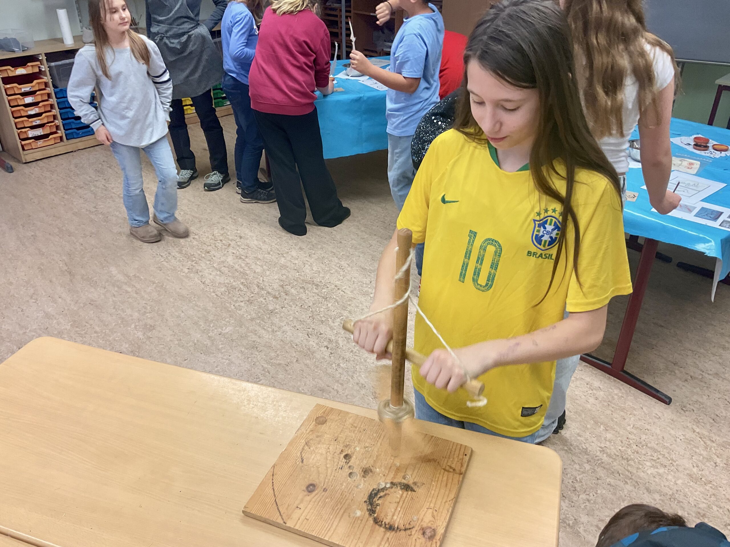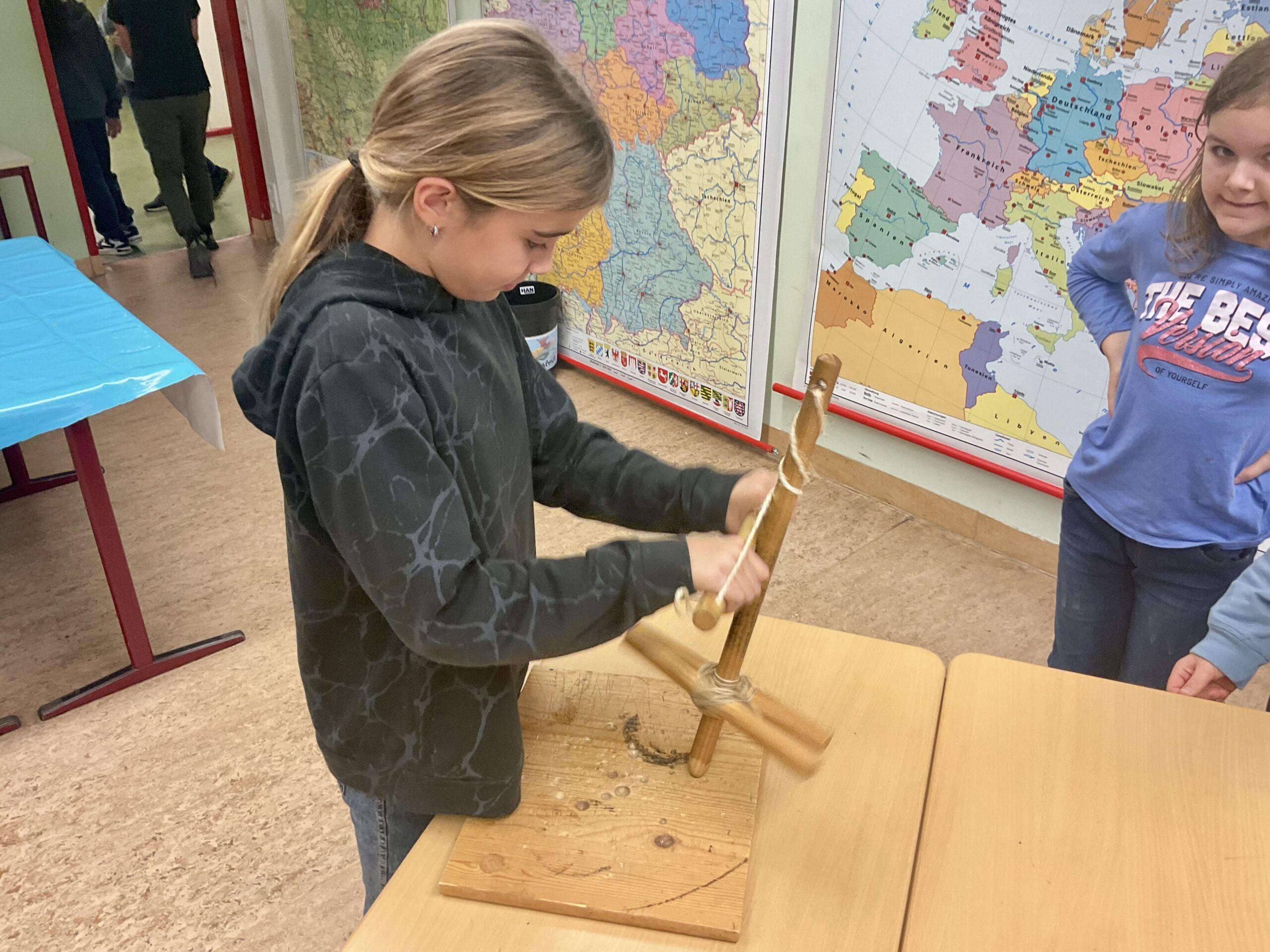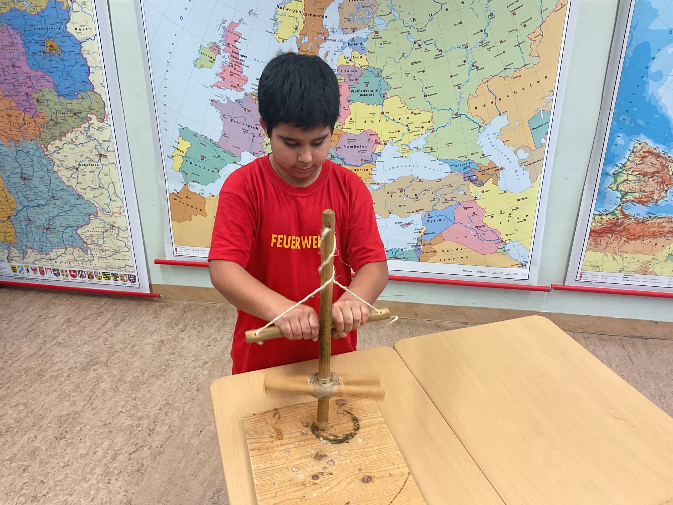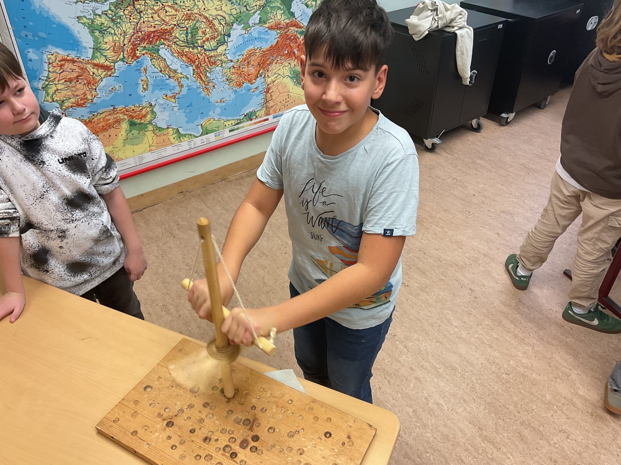 Ein besonderes Highlight war das Feuermachen wie in der Altsteinzeit. Mit viel Geduld und beeindruckender Ausdauer probierten die Kinder das Bohren mit dem Feuerbohrer aus. Konzentration, Technik und Muskelkraft waren gefragt – und die Begeisterung war groß, als erste Rauchfahnen aufstiegen.